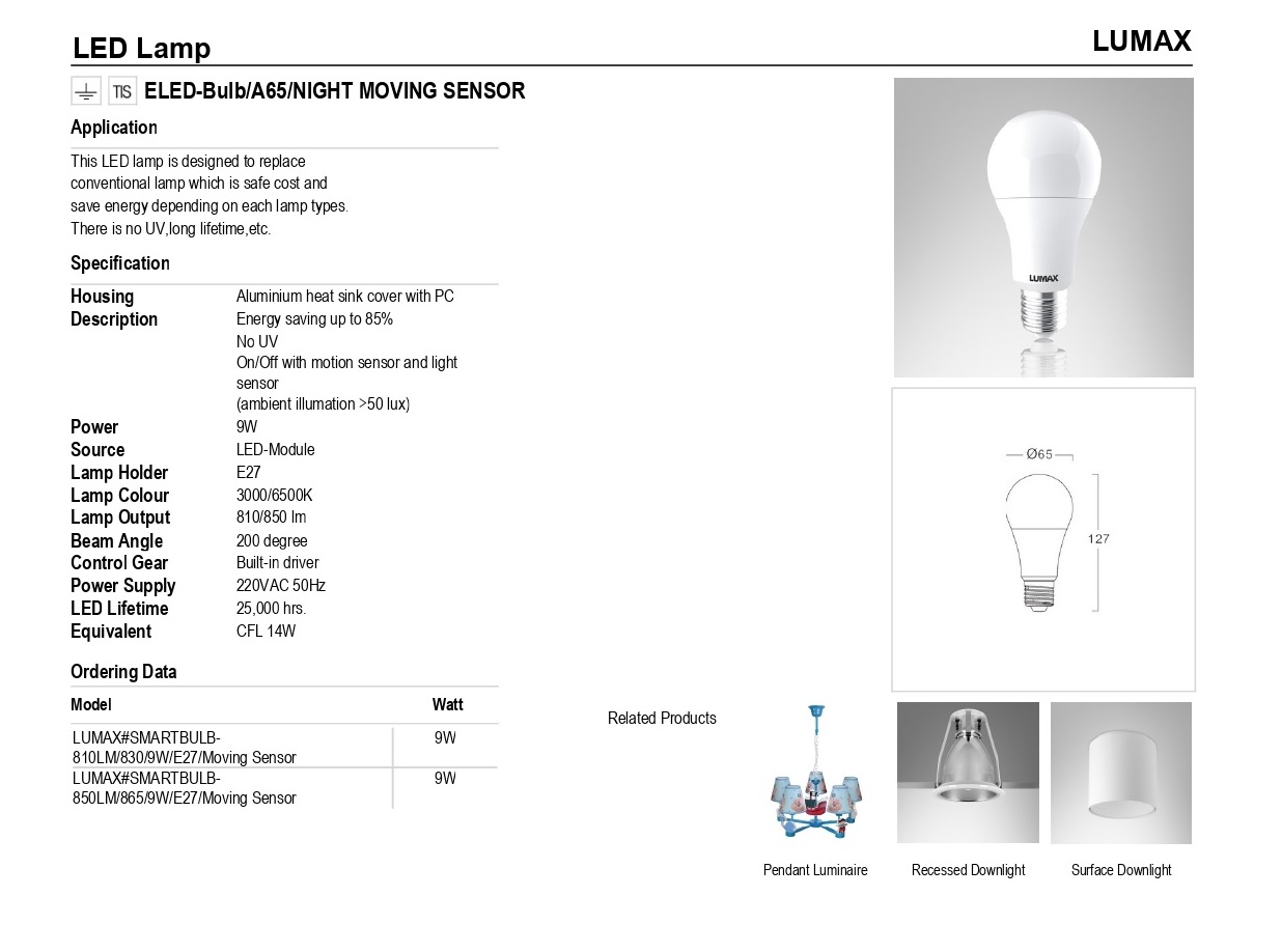 หลอดไฟแอลอีดีBulb A65 Night moving sersor 9W -Lumax